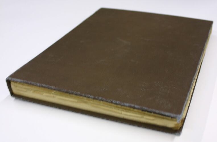 Brown cloth bound book with ruled pages marked with numbers at the top (up to 140). Most entries are handwritten in ink. 6 typewritten pages have been attached by adhesive tape. Some printed materials have been adhered to the pages. The diary also includes drawings of farming equipment. The original black front cover with page one on the reverse, has become detached. The diary appears to have been bound again in brown cloth.