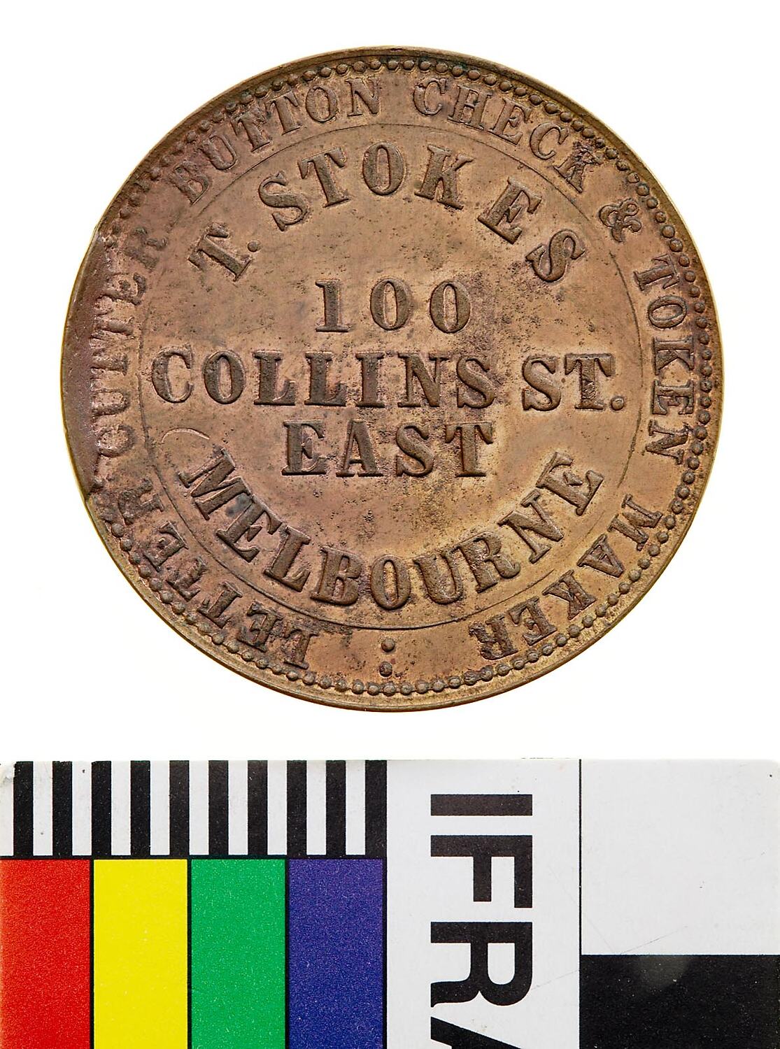 Obverse: T. STOKES 100 COLLINS ST. EAST MELBOURNE LETTER CUTTER BUTTON CHECK & TOKEN MAKER Reverse: VICTORIA 1862 T. STOKES MAKER MEL. IN VINO VERITAS