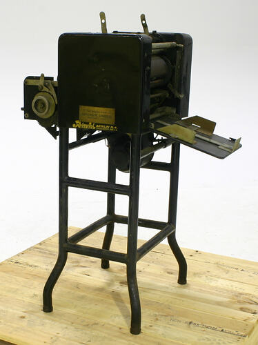 Metal label: Sole Australian Agents/Lendrum Ltd/Melbourne & Sydney Printed on side of machine in yellow paint - most likely a stencil: Rotaprint Berlin No. 4/AKT. GES Chausseestr. 128-129. ¼ HP S/P motor.