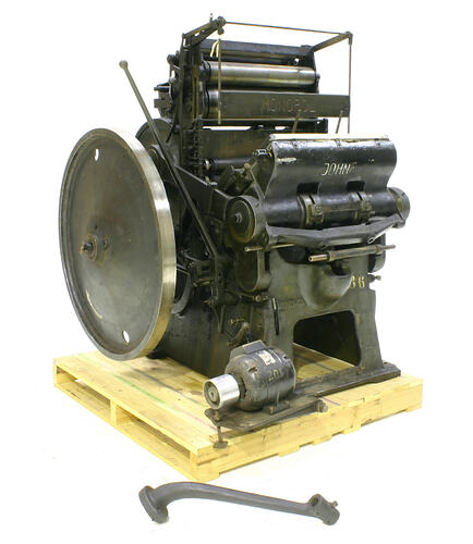 This clam shell type platen printing press was manufactured by Johne Monopol but the date of manufacture is unknown. The machine was used by the Government Printing Office and there is a record of a similar press purchased by them in 1937. It was a heavy duty press used for scoring and die-cutting. The letterpess machine was manufactured in Germany and is powered by an electric motor.