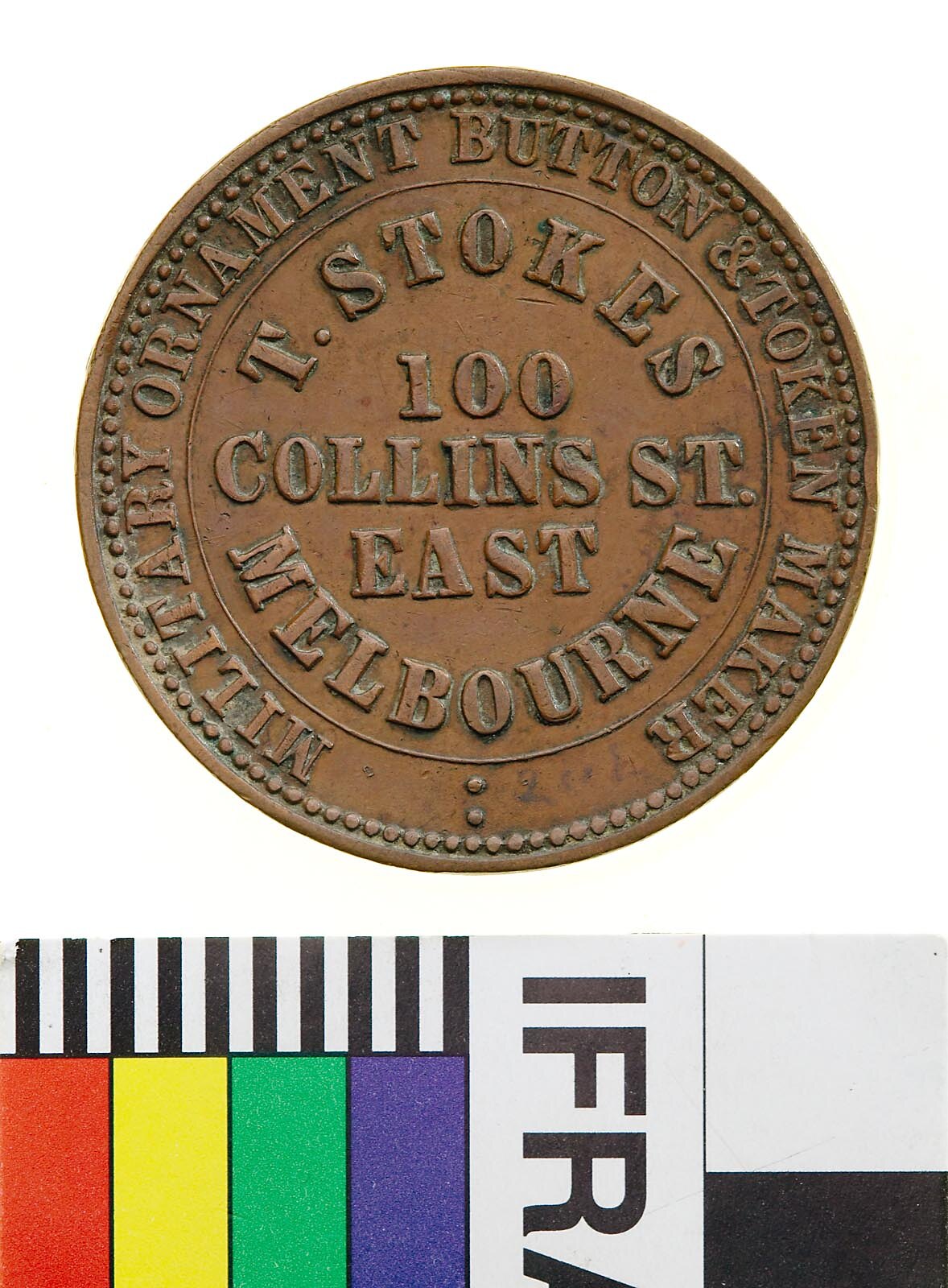Obverse: T. STOKES 100 COLLINS ST EAST MELBOURNE MILITARY ORNAMENT BUTTON & TOKEN MAKER : Reverse: VICTORIA 1862 IN VINO VERITAS T. STOKES MAKER MEL
