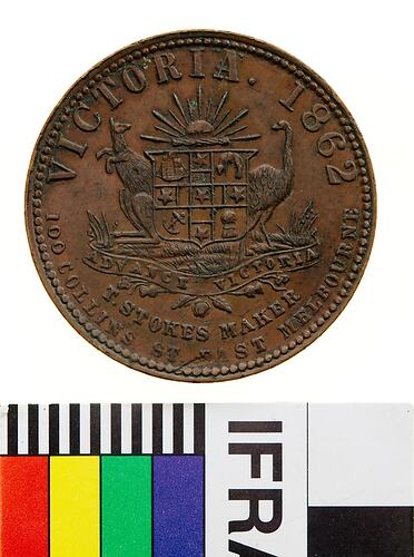Coat of arms consisting of a central shield set on grass covered ground and below Rising Sun. On left a kangaroo seated facing out but head back towards sun (sejant sinister reguardant) and on right emu with similar stance (passant dexter reguardant). Below ground line and set on bouquet of rose, thistles and shamrock, a ribbon with the motto ADVANCE VICTORIA. The shield is quartered by a cross with a star at the centre and at the end of each arm. The cross is not shaded. The quarters contain: top left, a three-masted sailing ship; top right, a golden fleece; bottom left, an anchor; and bottom right, a wheat sheaf. Around above, VICTORIA . 1862 around below in two lines, T. STOKES MAKER / 100 COLLINS ST. EAST MELBOURNE. The neck of the emu is poorly engraved with additional line to the left, the T of EAST is below the letters AK of MAKER. The standard references for the die used to make this token are: Andrews 13 = Heyde Arms 5 = Sharples Arms 6.