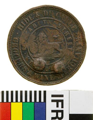 At centre within two concentric rings of text devided by a beaded circle, a male lion standing to left with head crowned facing front, its right paw is raised and rests on a shield bearing the Union Jack, its tail curved back over its body. Around, .HIDE & DE CARLE. GROCERS & WINE MERCHANTS / . ELIZABETH STREET . MELBOURNE