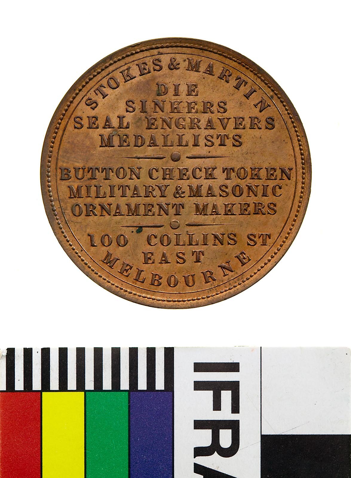 STOKES & MARTIN / DIE / SINKERS / SEAL ENGRAVERS / MEDALLISTS / BUTTON CHECK TOKEN / MILITARY & MASONIC / ORNAMENT MAKERS / 100 COLLINS ST. / EAST / MELBOURNE