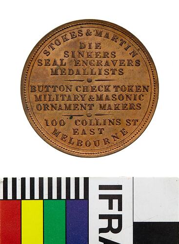 Obverse: STOKES & MARTIN DIE SINKERS SEAL ENGRAVERS MEDALLISTS BUTTON CHECK TOKEN MILITARY & MASONIC ORNAMENT MAKERS 100 COLLINS ST. EAST MELBOURNE Reverse: ONE PENNY TOKEN