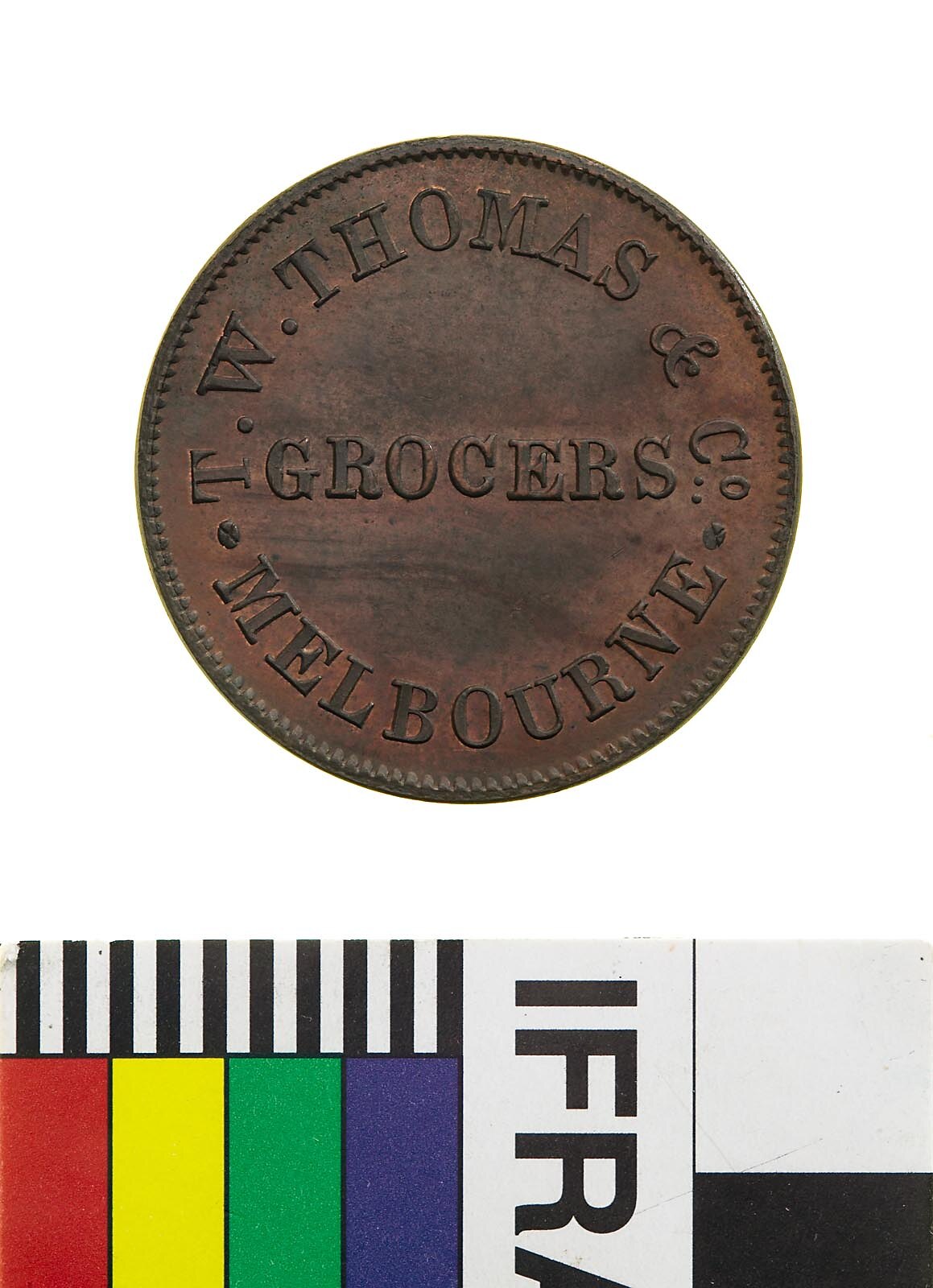 Obverse: T.W. THOMAS & Co GROCERS MELBOURNE Reverse: IN COMMEMORATION OF THE LANDING OF SIR CHARLES HOTHAM 22ND JUNE 1854