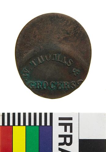 A mis-strike of a copper halfpenny trade token (28 * 33 mm). It features the name and business of the issuing firm: T.W. THOMAS & Co., grocers Melbourne and commemorates on the reverse the arrival of Sir Charles Hotham on 22 June 1854. The lettering is badly formed due to the mis-striking of the piece and appears ornamental.