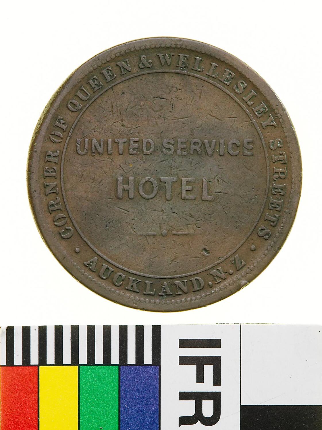 A round copper token (34 mm diameter). The token features the name, address and business of the issuer: United Service Hotel, corner of Queen and William Streets, Auckland. The reverse features a profile head of Queen Victoria and the date 1874.