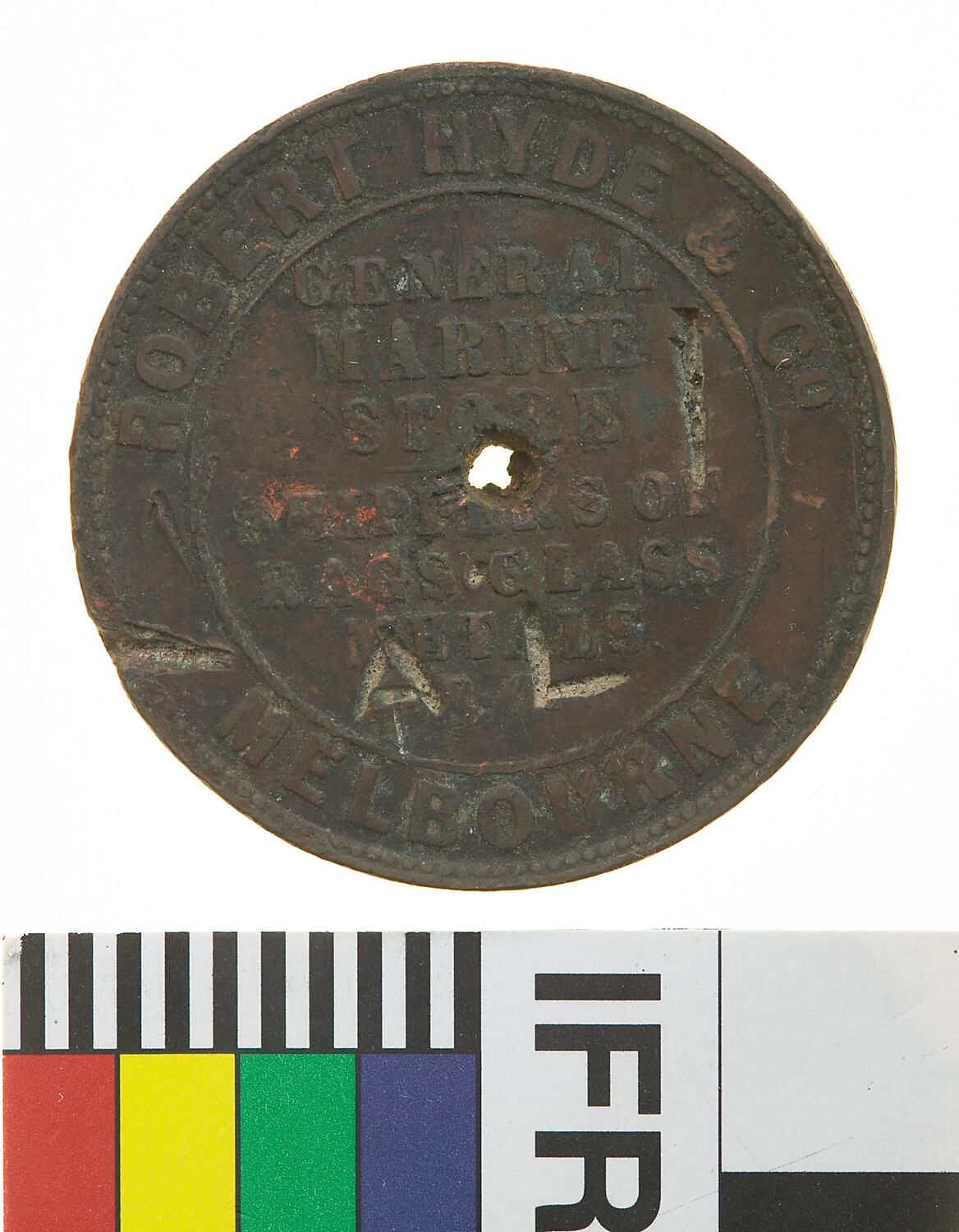 At centre within a line circle, GENERAL / MARINE / STORE / - / SHIPPERS OF / RAGS GLASS / METALS / &c.; around above, ROBERT HYDE & CO; around below, MELBOURNE. This token has been holed at the centre and surcharged AL.