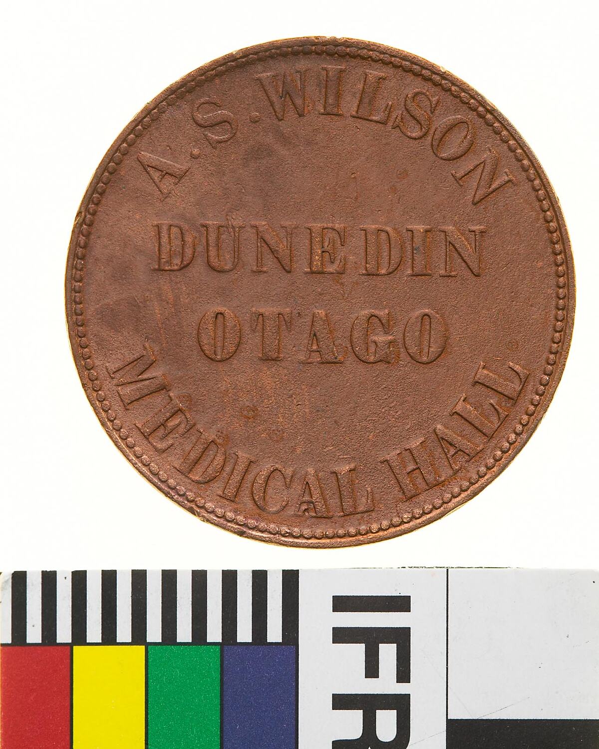 Copper One Penny Token, minted by W.J. Taylor, London. Issued by A.S. Wilson, Chemist, Dunedin, 1857. Andrew Smith Wilson established a chemist's business in Dunedin under the name 'Medical Hall' in 1852, having recently arrived from Scotland. In 1863 he sold his business to Messrs. Wilkinson and Dixon. so he could work for worked for Reynolds & Co., Aerated water manufacturers. He is also said to have been one of the first photographers in Dunedin and is credited with having taken the first photograph of the town.