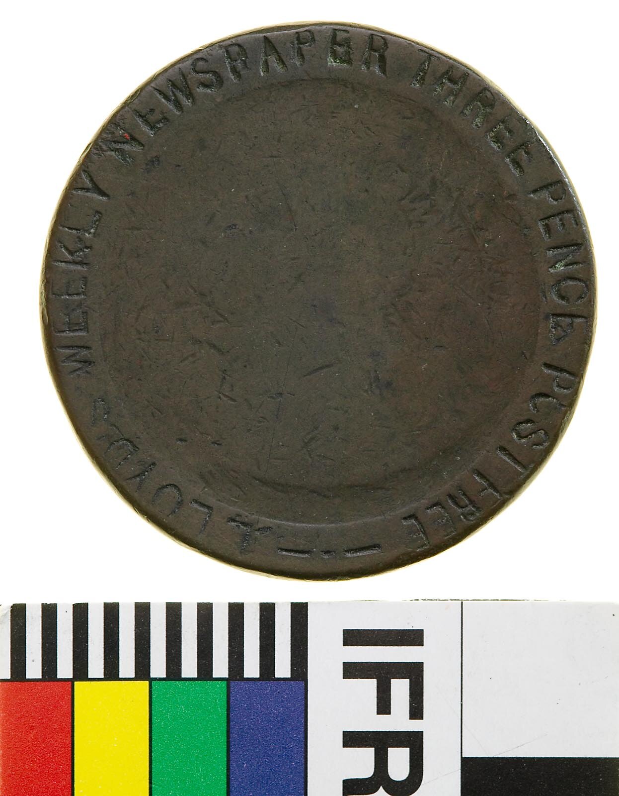 Obverse: LLOYDS WEEKLY NEWSPAPER THREEPENCE POST FREE Reverse: PURCHASE NUMBER ONE OF LLOYDS NEW PENNY PUBLICATION