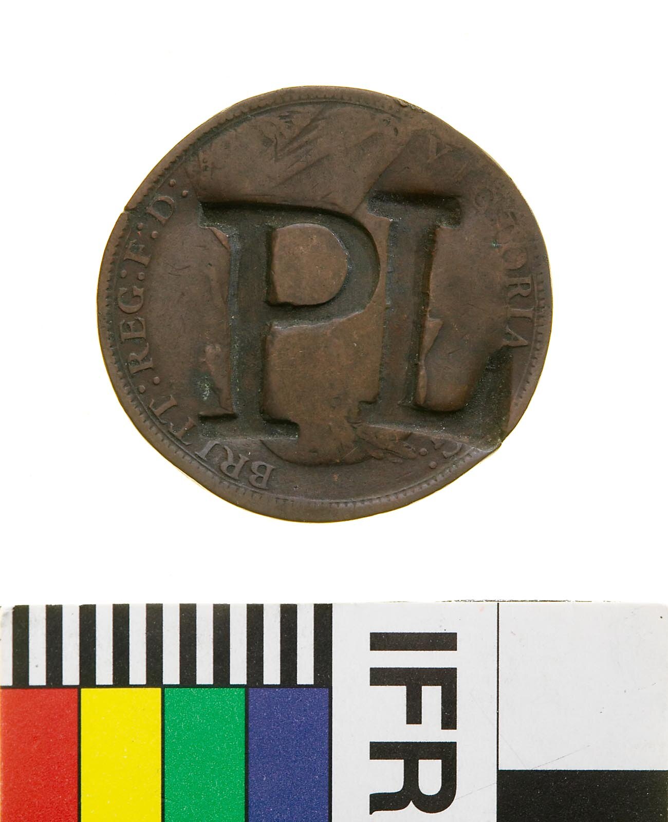 Copper Halfpenny, minted by Royal Mint, London. Issued by Queen Victoria, HRH, Great Britain of Great Britain & Ireland, 1870. Surcharged PL.