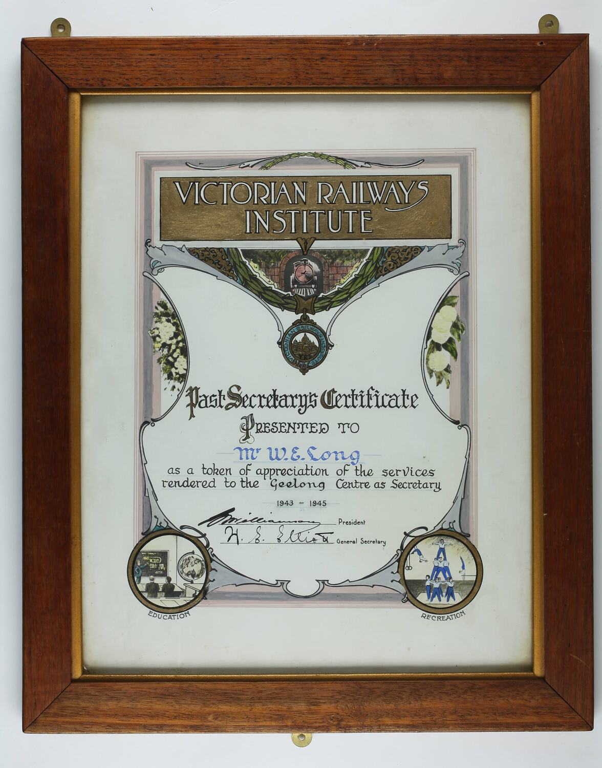 Framed, illustrated certificate presented by the Victorian Railways Institute (VRI) to W.E. Long in appreciation of services rendered to the Geelong Centre as Secretary between 1943 and 1945.