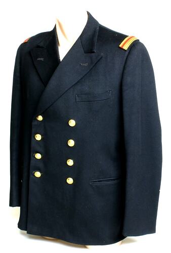 Black wool, double-breasted jacket with black lining, one breast patch pocket and two hip patch pockets. Features eight brass buttons on the front with anchor, crown and wreath insignias. The shoulder straps feature a gold and red striped band. Two medical wooden tongue compressors are slotted into the breast pocket. In the left hip pocket are eight "Orient Line" wine cards, four held together with a paper clip, each printed and handwritten; a "Royal Festival Hall" envelope printed in black ink; and a tag with handwritten inscription in pencil.