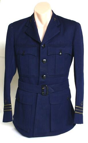 Single breasted navy wool jacket, with black cotton lining. Features two buttoned breast pockets and two buttoned hip pockets. A cloth waist belt with a metal buckle and eyelets is attached via two leather loops. The jacket has four central black buttons. All buttons are black Bakelite and feature, in relief, a crown above a flying eagle. Three yellow and black bands are on the lower part of each sleeve (the central band being thinner) and a brass crown and eagle are sewn on each sleeve above the bands. A cloth badge reading 'Australia' appears on each shoulder. Below it, on the right side is a blue cloth badge featuring a gold and red crown with text in a scroll that reads 'British Commonwealth Forces'. Each side of the collar features a metal caduceus badge, the symbol of a rod entwined by two snakes, topped by a pair of wings and crown. The jacket has a single vent in the centre back.