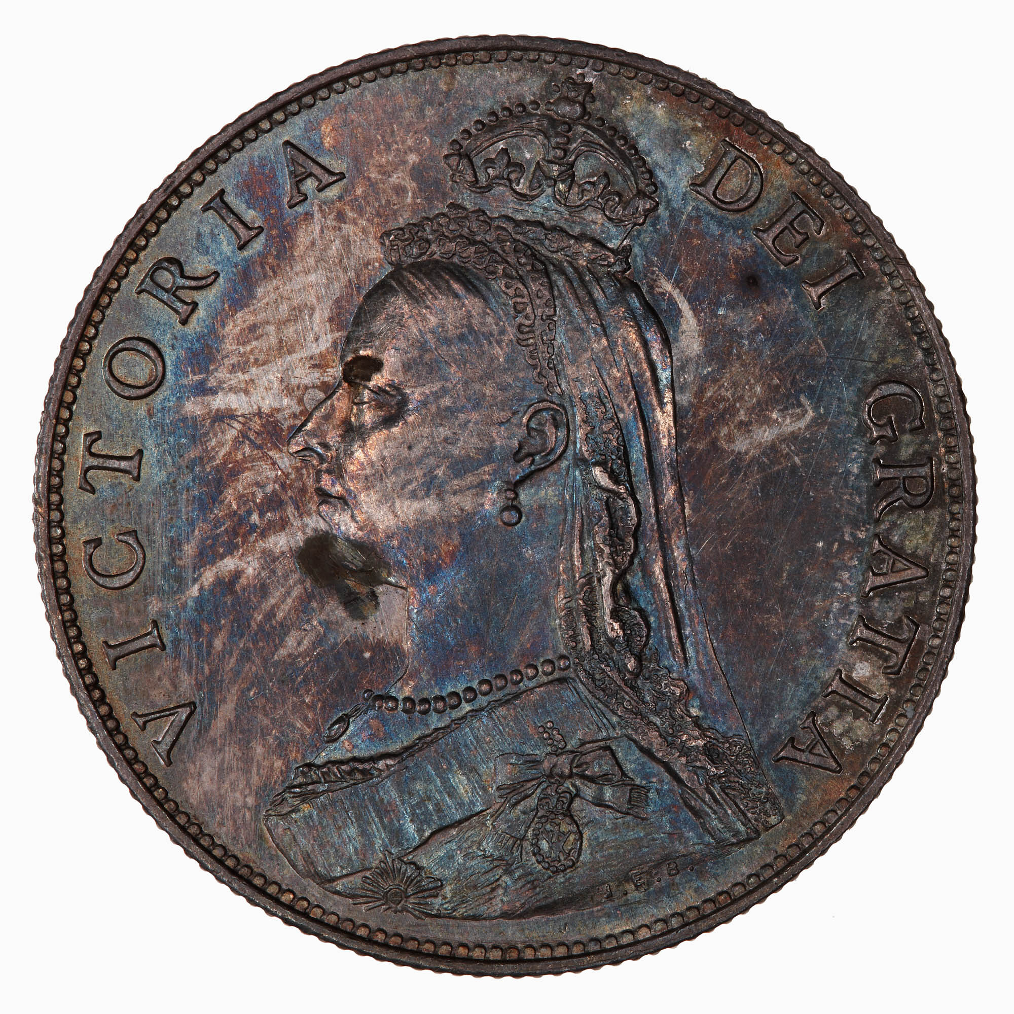 Bust of the Queen facing left the small wearing imperial crown, long veil falling behind her head, pearl necklace and earring, Ribbon and Star of the Garter and the badge of the Imperial Order of India; in small raised letters on the bust truncation, the artist's initials J.E.B. (Joseph Edgar Boehm); around, VICTORIA DEI GRATIA