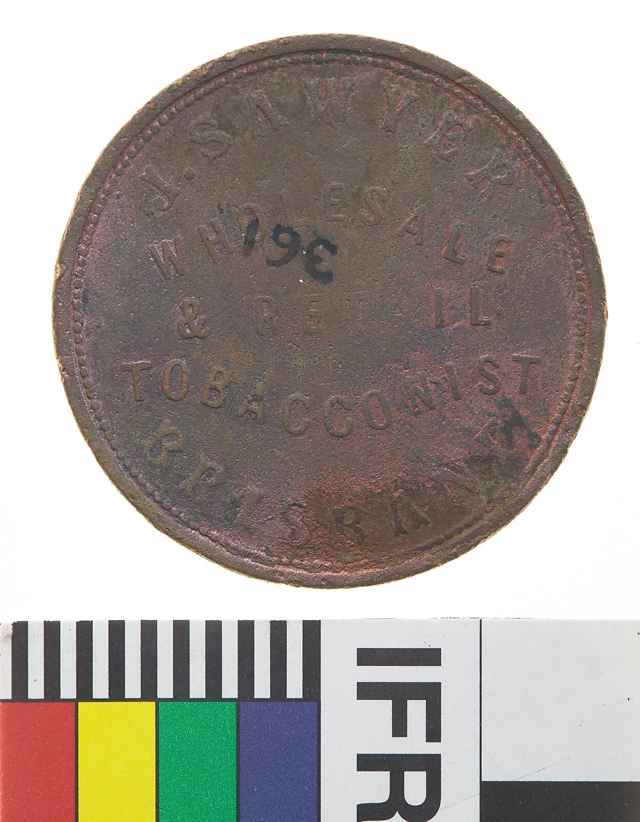 A round copper token (34 mm diameter). The token features the name address and business of the issuer: J. Sawyer, Brisbane, Wholesale and Retail Tobacconist. The reverse features a set of Arms with emu and kangaroo supporters set below on a ribbon the motto ADVANCE AUSTRALIA, around QUEENSLAND 1864. The reverse has been surcharged S. This token has been cleaned and the number 361 is written in ink on the obverse.