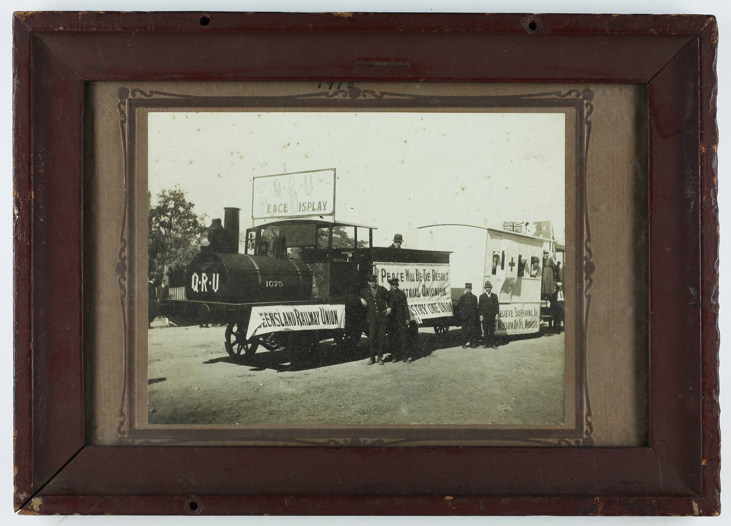 On banners: " Q.R.U / PEACE DISPLAY ", " QUEENSLAND RAILWAY UNION ", " PEACE WILL BE THE RESULT / [illegible]STRIAL UNIONISM / [illegible]USTRY ONE UNION ", " [obscured]ELIEVE SUFFERING IS / [obscured]E MISSION OF THE WORKERS " On locomotive: " Q.R.U", " 1075 "