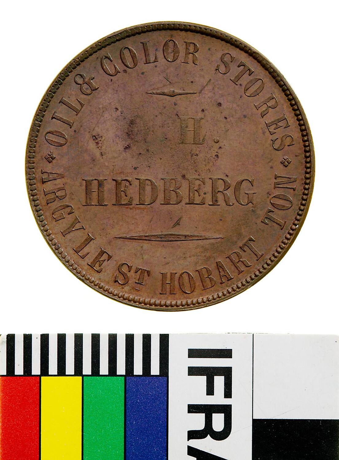 Obverse: O.H. HEDBERG OIL & COLOUR STORE ARGYLE ST. HOBART TON Reverse: MELBOURNE VICTORIA 1860