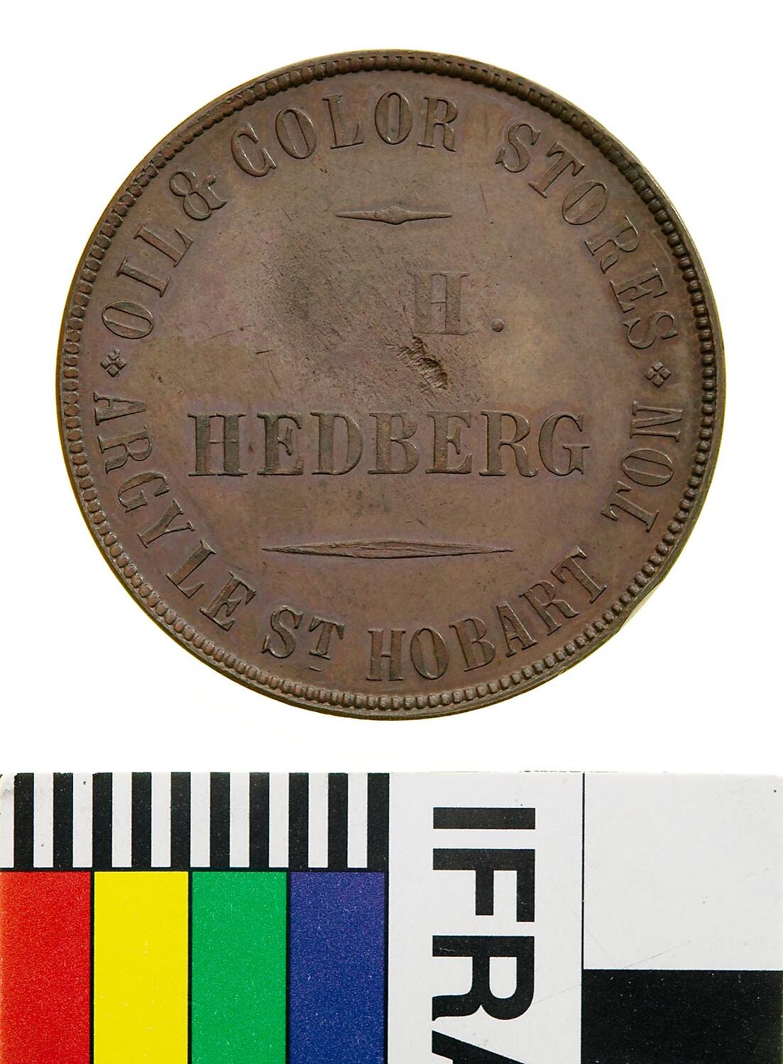 Obverse: O.H. HEDBERG OIL & COLOUR STORE ARGYLE ST. HOBART TON Reverse: MELBOURNE VICTORIA 1860
