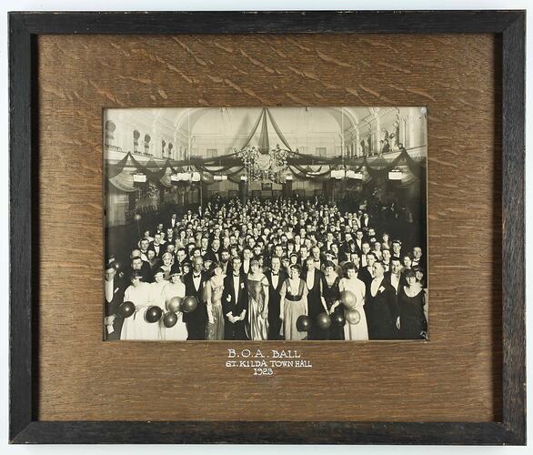 Below photograph: ' B.O.A. BALL / ST. KILDA TOWN HALL / 1923 ' Reverse, top right, handwritten: ' B.O.A. Ball / St Kilda Town Hall / 1923 / 1923 ' Reverse, sticker: ' W. & G. DEAN / PICTURE / FRAMES / ARTISTS MATERIALS / HOME DECORATORS / EQUITABLE / PLACE / & / 346 LT. COLLINS ST. MELB.'