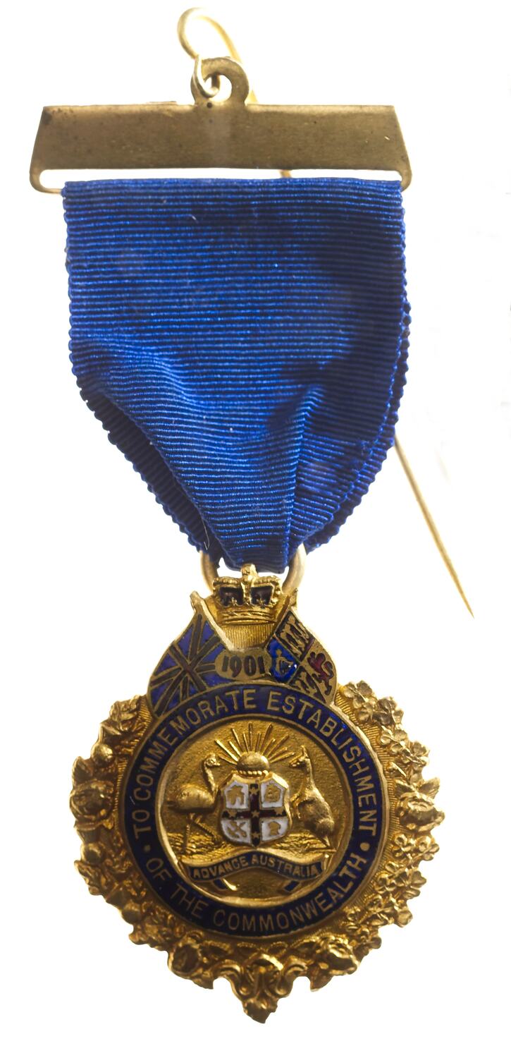 Gilt and enamelled medal on ribbon, issued to commemorate the establishment of the Commonwealth of Australia in 1901. It shows the Australian arms within a wreath of roses and thistles.