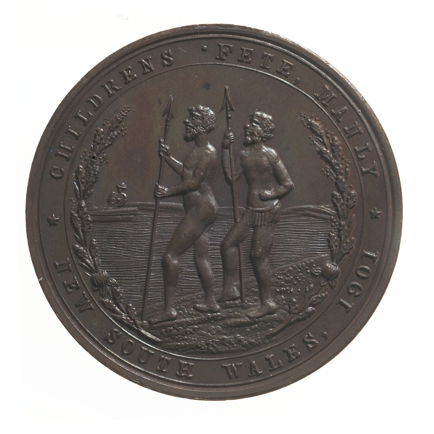 Plain (edge) CHILDRENS .FETE, MANLY * NEW SOUTH WALES, 1901 * Two Aborigines stg., holding spears, in the background an approaching boat (obverse) IN COMMEMORATION OF A USTRALIAN COMMONWEALTH/. 1901. Australian coat of arms encircled by two half wreaths and 2 clasping hands btm(reverse)