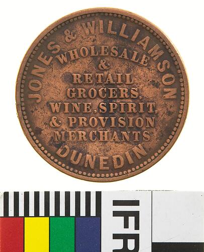 Obverse: JONES & WILLIAMSON WHOLESALE & RETAIL GROCERS, WINE, SPIRIT & PROVISION MERCHANTS DUNEDIN Reverse: NEW ZEALAND 1858