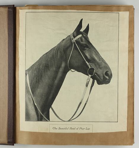 Bound scrapbook with newspaper cuttings relating to Phar Lap, jockey Jim Pike, strapper Tommy Woodcock, trainer/owner Harry Telford, and owner David J. Davis from the periods 1930-1939 and 1960-1982. There are also two loose photographs in a folio at the rear of the scrapbook. One has an image of jockey Jim Pike on Phar Lap and the other is of the son of owner/trainer Harry Telford, Gerald, holding up the 1930 Melbourne Cup.