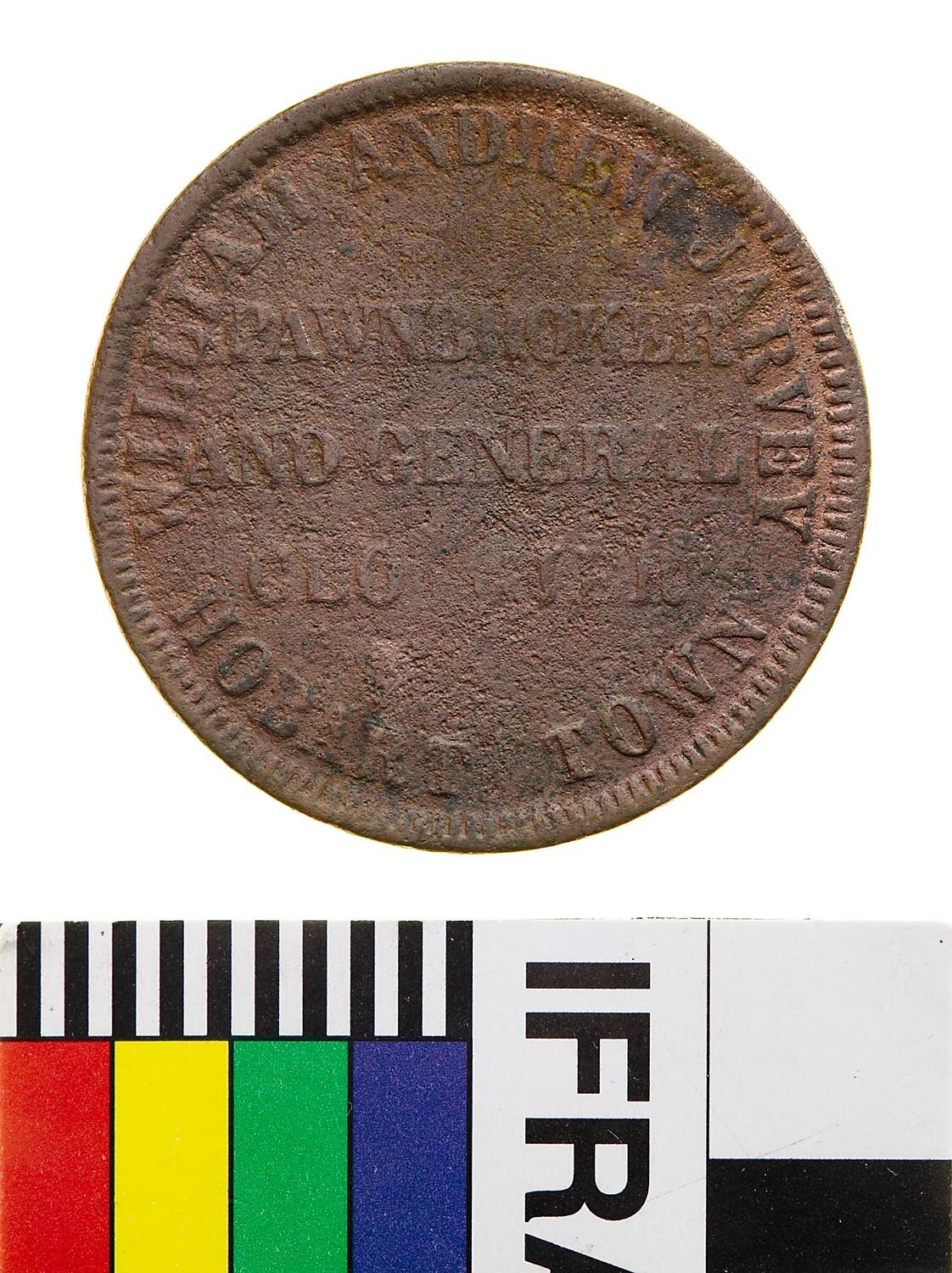 Legend in five lines, the first and last curved around the rim: WILLIAM ANDREW JARVEY / PAWNBROKER / AND GENERAL / CLOTHIER / HOBART TOWN