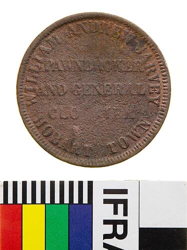 Copper one Penny Token, minted by an unknown British Mint, circa 1860. Issued by William Andrew Jarvey, a Pawnbroker, in Hobart. William Andrew Jarvey arrived in Tasmania on 8 April 1844 and was appointed a Police Constable. In 1849 he obtained permission to marry Catherine Jane Shaw, a 25 year-old Irish convict. The following year he resigned his commission and became the Schoolmaster at the Cascades, outside Hobart. In 1854 he left the school and established himself as a Clothier and Pawnbroker in Murray Street, Hobart. He kept this business until 1862 and then attempted farming at Wattle Grove in the Huon Valley, south of Hobart, but gave up his efforts by November of that year. He then convinced the owners of the steamer Titania that he was a suitable Captain for their ship, supplying mining communities in New Zealand. In April 1864, Catherine Jarvey sold the farm and, with their five children, followed Jarvey to New Zealand. In August Jarvey beat his wife until she was unconscious. The following month he purchased some rat poison from a chemist, and according to the published versions of the trial, Catherine Jarvey was taken ill with 'fits' within a few days of the purchase. On the evening of 26 September, Jarvey administered a fatal dose of strychnine and his wife died of an epileptic fit. Jarvey was tried twice for his wife's murder and eventually found guilty, he was hanged on 25 October 1865, the first man to be hanged in Dunedin.