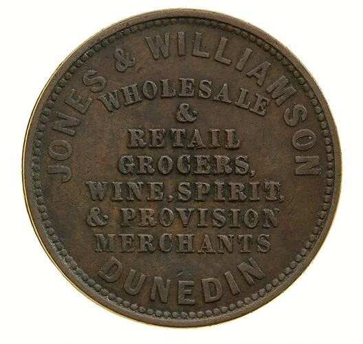 Obverse: JONES & WILLIAMSON WHOLESALE & RETAIL GROCERS, WINE, SPIRIT & PROVISION MERCHANTS DUNEDIN Reverse: NEW ZEALAND 1858