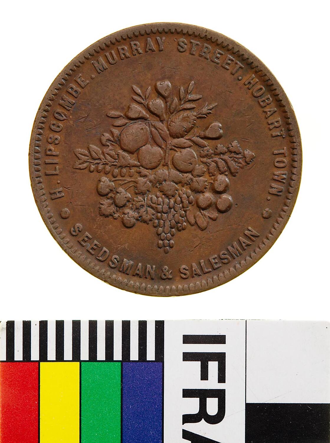 A round copper token (34 mm diameter) featuring the name, address and business of the issuer: H. Lipscombe, Murray St. Hobart Town, seedsman, salesman and shipping supply agent. It features a bouquet of produce that includes grapes, apples, pears, mellon and pineapple.