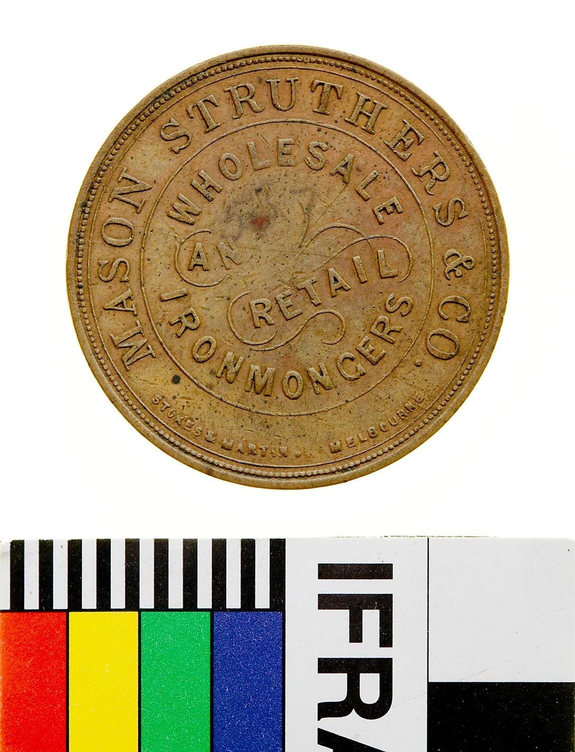 At centre within lin circle, WHOLESALE / AND / RETAIL / IRONMONGERS around above, MASON STRUTHERS & CO around below in small letters, STOKES & MARTIN MELBOURNE