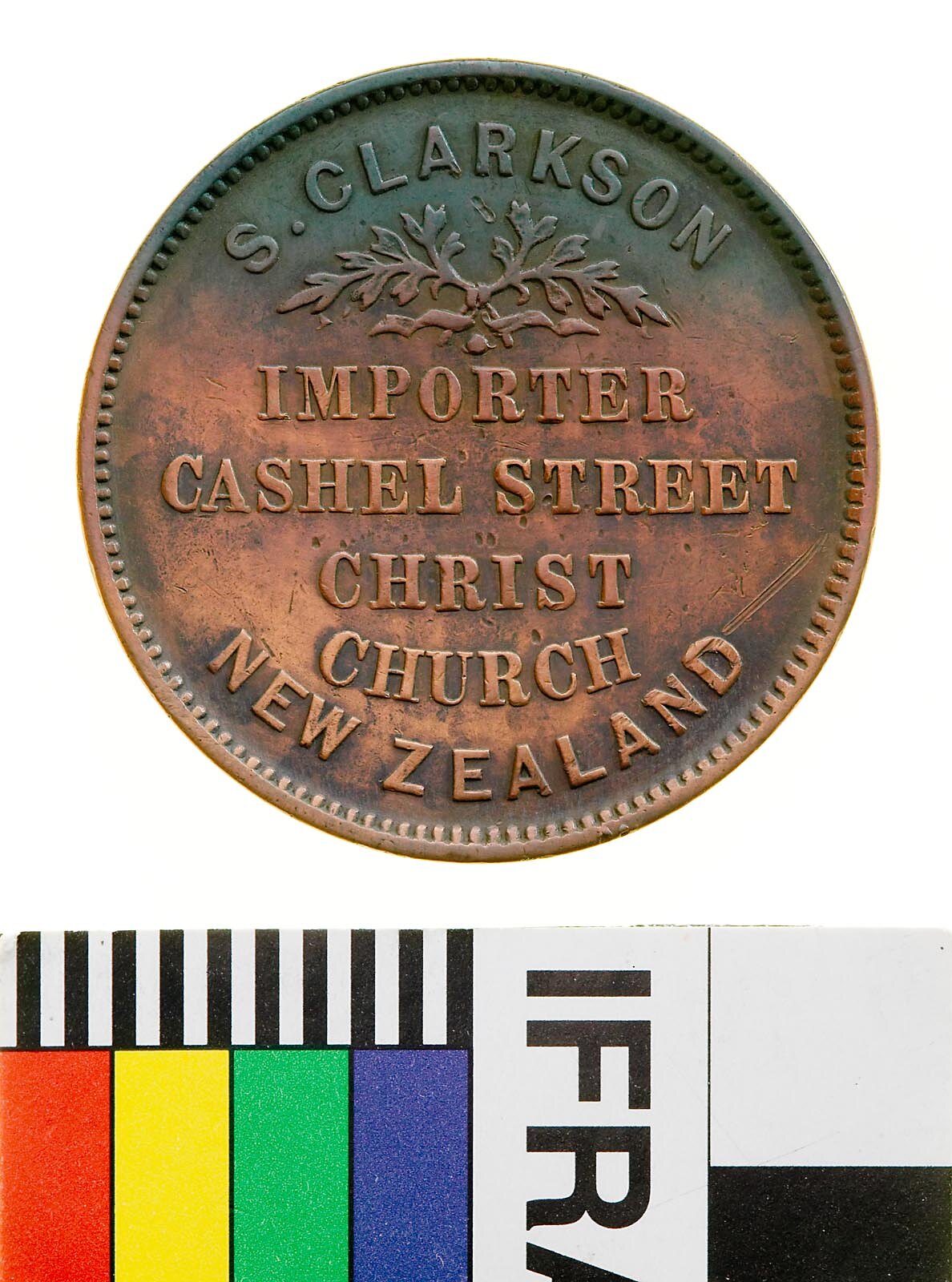 Obverse: S. CLARKSON IMPORTER CASHEL STREET CHRIST CHURCH NEW ZEALAND Reverse: NEW ZEALAND 1875