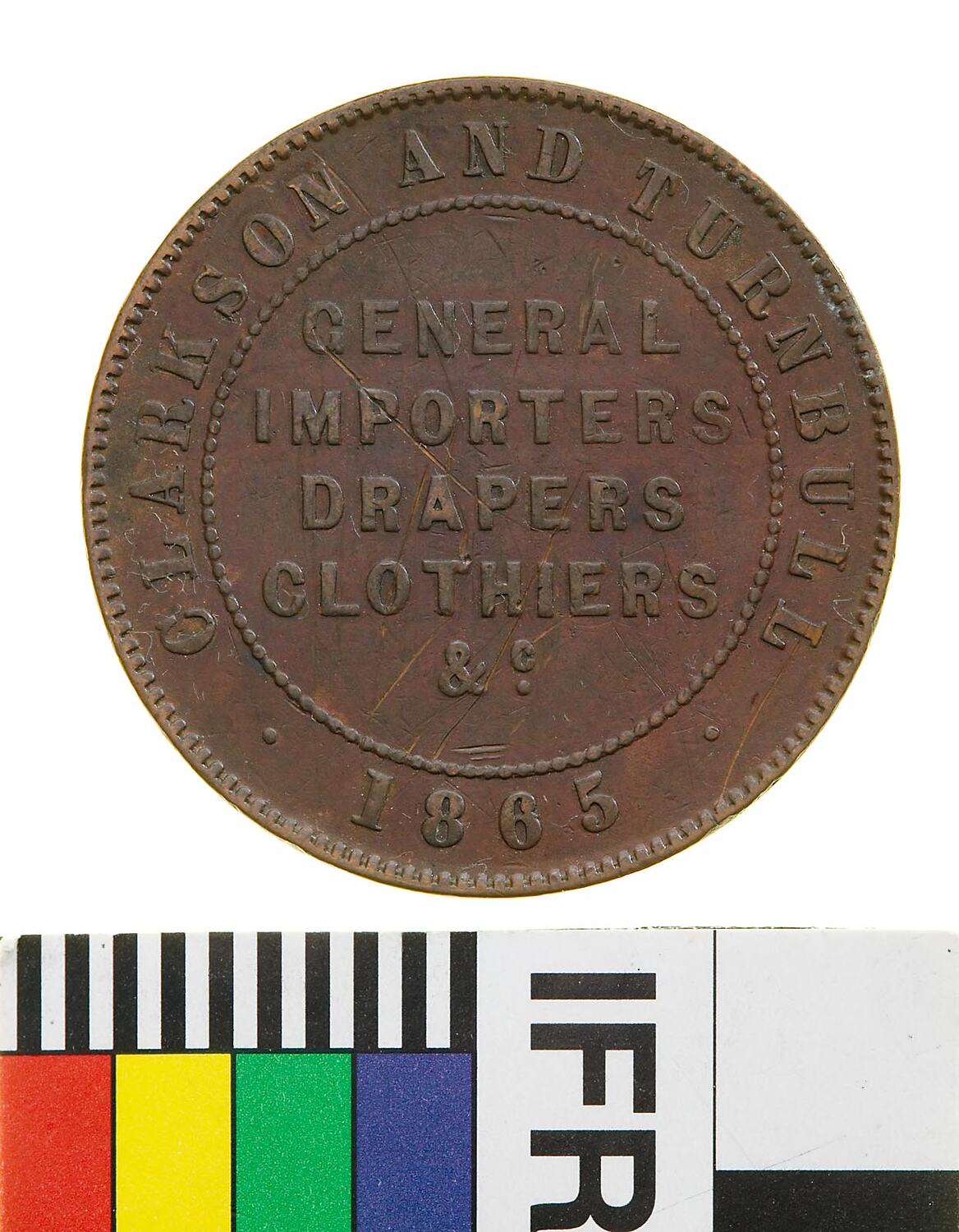 Around a circle of beads, CLARKSON & TURNBULL 1865 within in five lines, GENERAL / IMPORTERS / DRAPERS / CLOTHIERS / &c