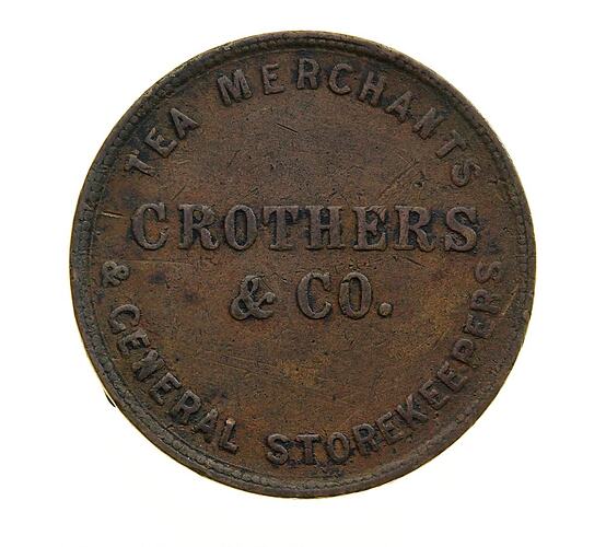 Copper One Penny Token, minted by Thomas Stokes, Melbourne. Issued by Crothers & Co, Tea Merchants & Storekeepers, Stawell, circa 1862. The three Crothers brothers, William, David and Hugh, arrived from Canada in August 1854. The brothers travelled the country (most likely trying their luck at the various gold fields) for ten years before deciding to open a store at Stawell. They opened their store in Main Street, Stawell in 1865. After a number of years David left the partnership and opened his own store in Melbourne. The other brothers continued their business until they retired in 1900. In 1910 William was living in Armadale, Hugh was in Stawell and David still running his own business, was in Oakleigh. They issued their tokens after they became illegal, the first penny and the halfpenny being issued in 1865, with the other two tokens issued in later years.