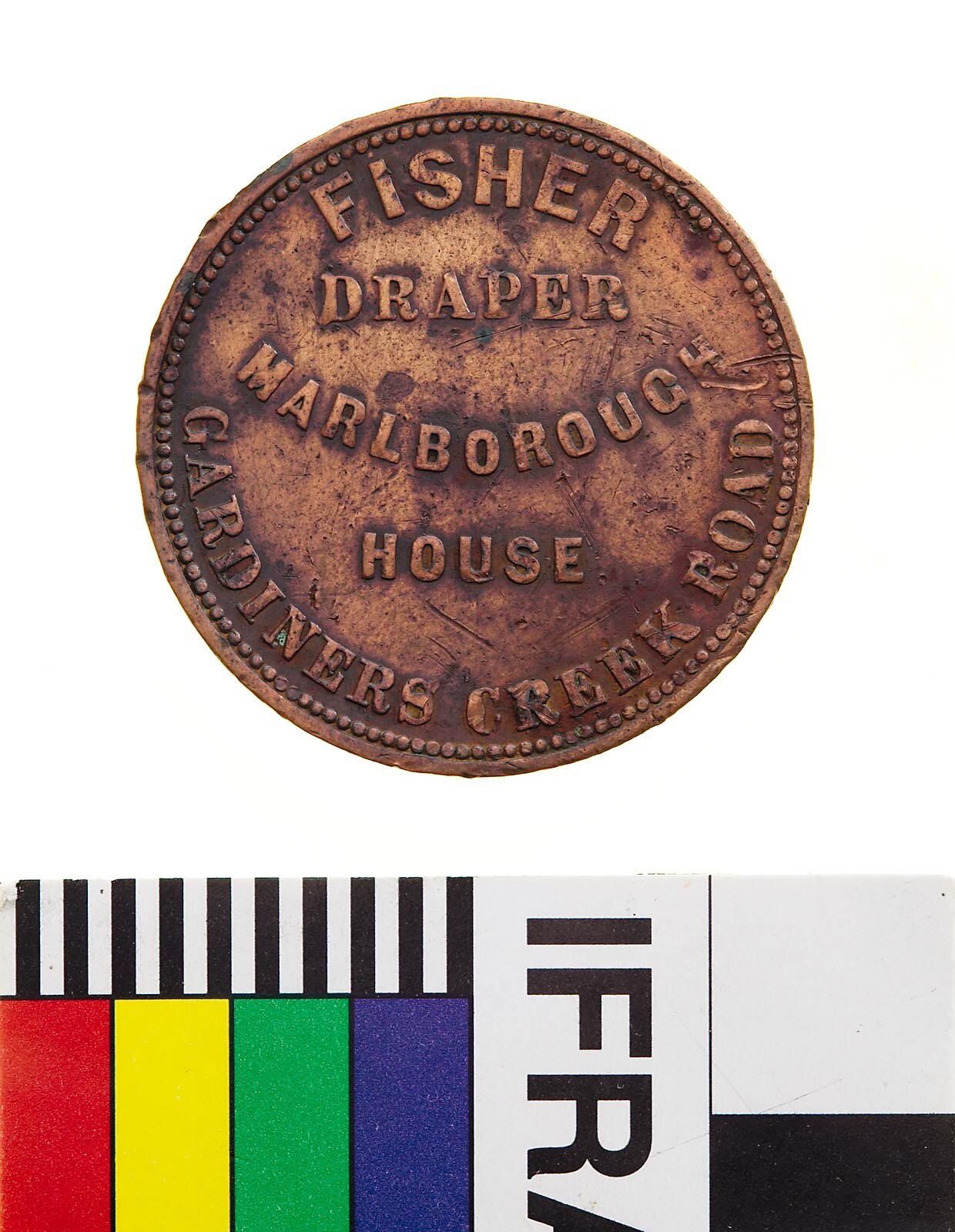 Obverse: FISHER DRAPER MARLBOROUGH HOUSE GARDENERS CREEK ROAD Reverse: AUSTRALIA 1857