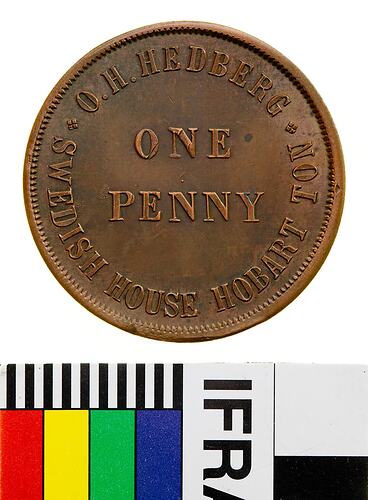 Obverse: O.H. HEDBERG SWEDISH HOUSE HOBART TON ONE PENNY Reverse: AUSTRALIA W.J. TAYLOR LONDON