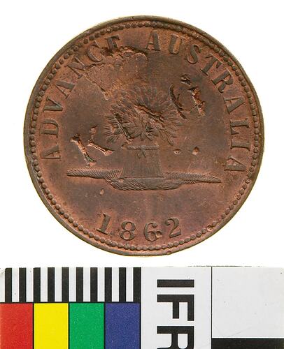 Copper one Penny token, minted by Thomas Stokes of Melbourne. Issued by Thomas Stokes, Diesinker, Token Maker & Medallist, Melbourne, in 1862. Surcharged KING. This token is one of the large number of anonymous tokens struck by Stokes late in 1862. Anonymous issues were manufactured employing two stock dies. Thomas Stokes migrated to Australia in search of gold in the 1850s, being unsuccessful he returned to his trade as a die-maker and button maker. In 1857 Stokes acquired a press from W.J. Taylor and began to mint large numbers of tradesmen's tokens. He also commenced the Australian Medallic Issues. In 1873 Stokes took a partner, Martin, and the business was re-named Stokes & Martin. In 1893 a disastrous fire damaged a large portion of the business, Martin had forgotten to renew the fire insurance policy, and the partnership was dissolved as a result. Stokes rebuilt the business as Stokes & Son. The business became a proprietary concern in 1911, re-named Stokes & Son Pty Ltd. In 1935 the business moved to Brunswick, and in 1962 Stokes became a public company, renamed Stokes (Australasia) Pty Ltd. Today the business is located in Ringwood.