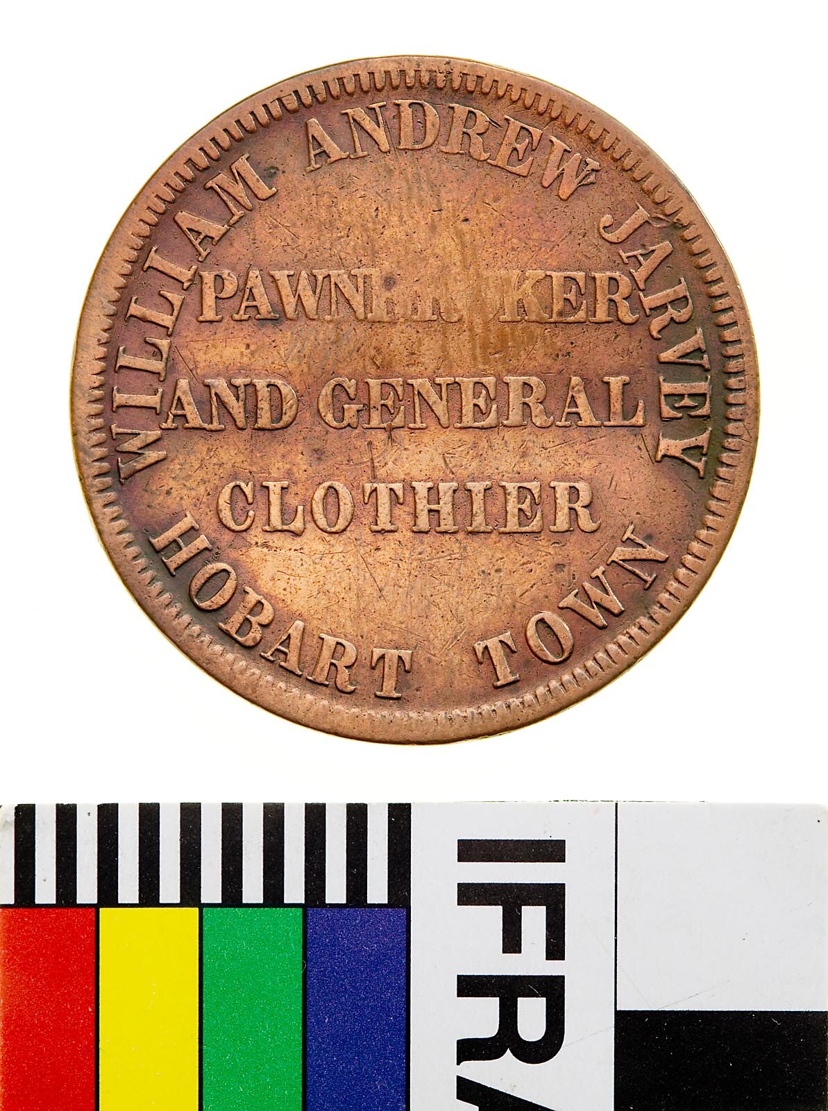 Legend in five lines, the first and last curved around the rim: WILLIAM ANDREW JARVEY / PAWNBROKER / AND GENERAL / CLOTHIER / HOBART TOWN