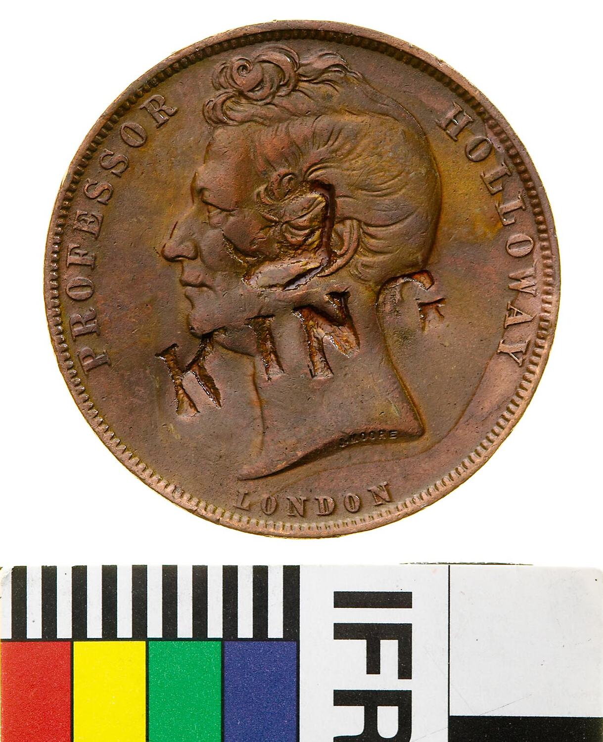 Head of Professor Holloway facing left with J. MOORE (the maker's name) incuse on neck truncation; around, PROFESSOR HOLLOWAY; below, LONDON, surcharged KING below a crown L