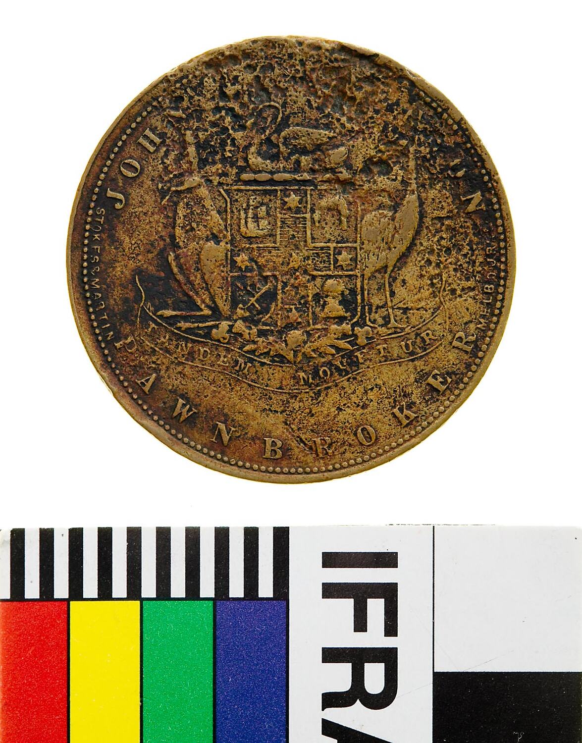 At centre a coat of arms with a swan as crest and kangaroo and emu supporters. The shield is quartered by a cross with a star at the centre and at the end of each arm, top left, three-masted sailing ship, top right, golden fleece, lower left, crossed pick and spade, lower right, wheat-sheaf. The shiels is set above a bouquet of rose, thistle and shamrock set above a ribbon with the Latin motto TANDEM MOVETUR. Around above, JOHN HENDERSON; below, PAWNBROKER; in tiny letters on either side the makers name, STOKES & MARTIN MELBOURNE