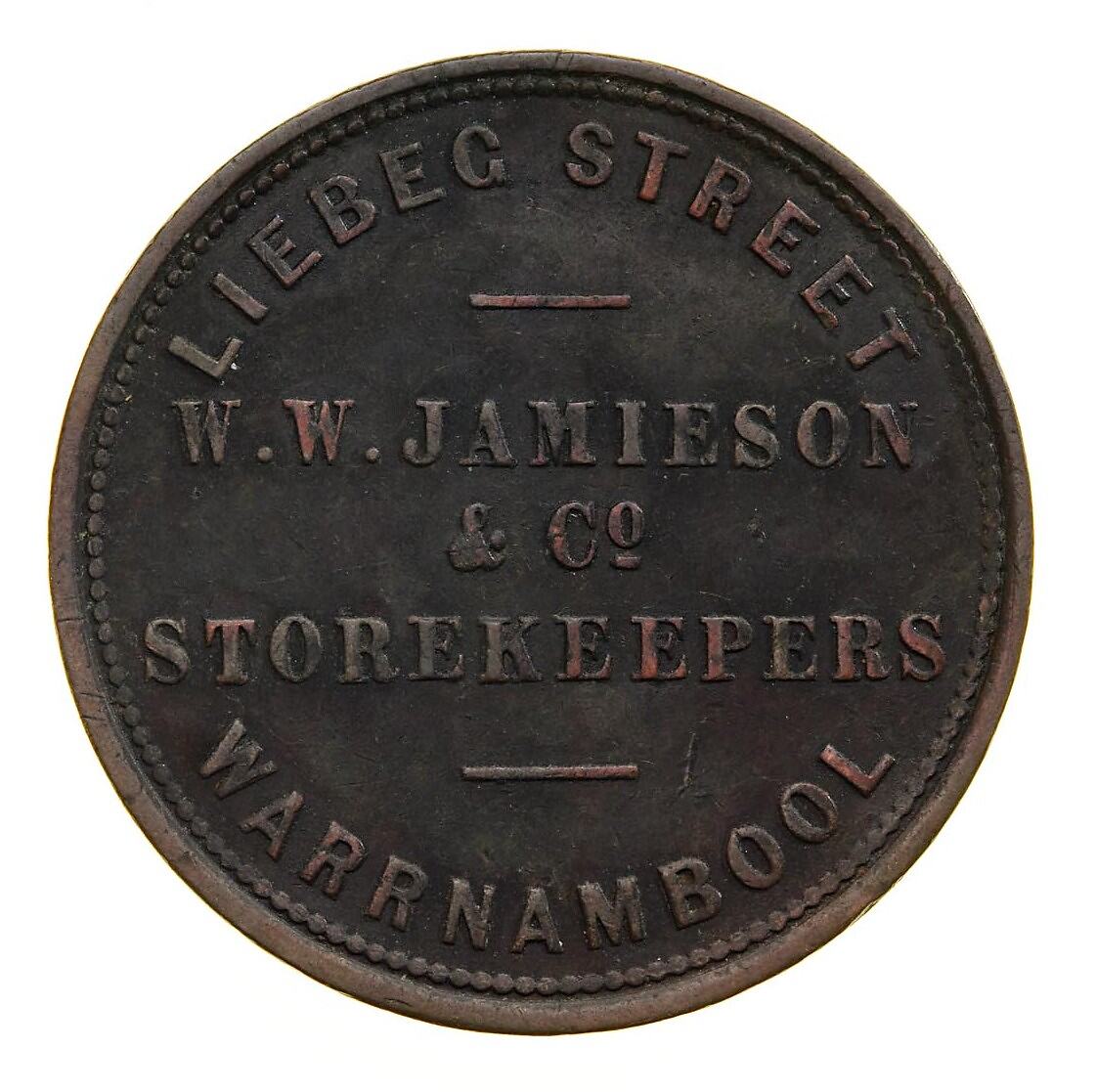 Obverse: W.W. JAMIESON & CO. STOREKEEPERS LIEBEG [sic] STREET WARRNAMBOOL VICTORIA STOREKEEPERS Reverse: AUSTRALIA 1862