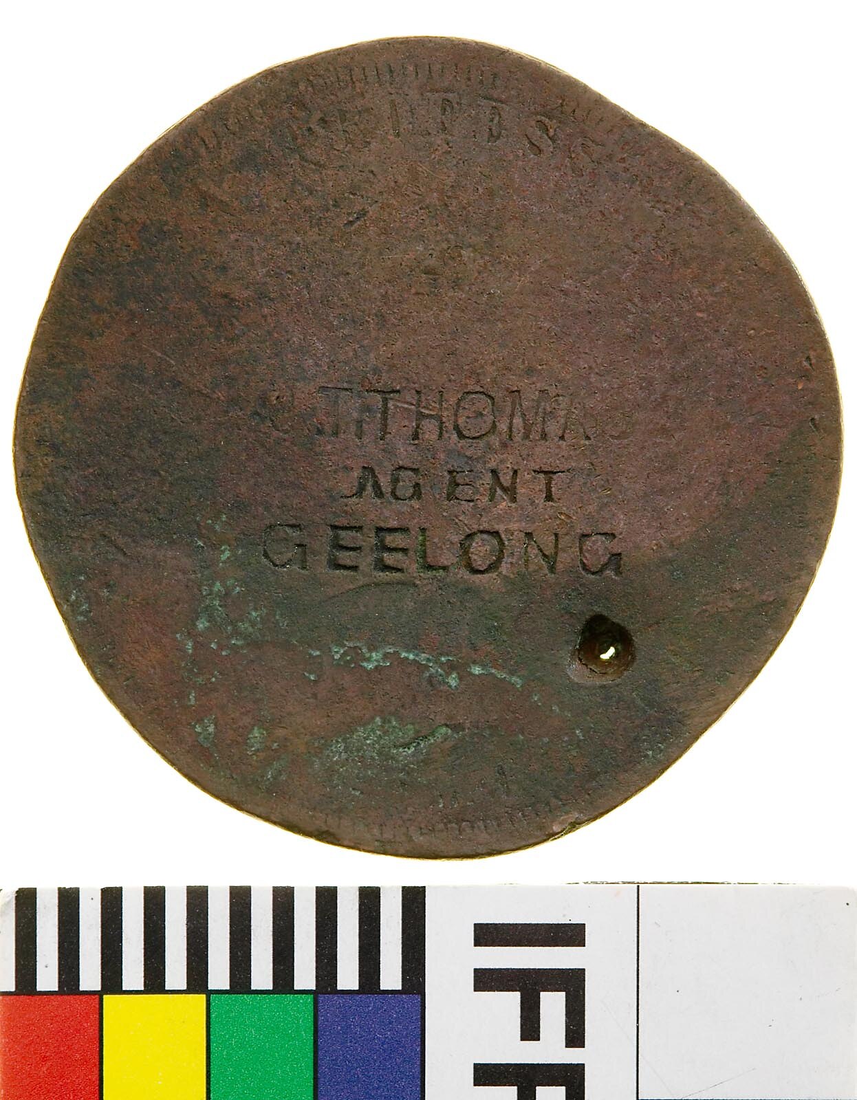 Copper One Penny Token minted by J. Moore of Birmingham. Issued to promote Professor Holloway's pills and ointments in 1857, it has been surcharged J.T. THOMAS AGENT GEELONG.