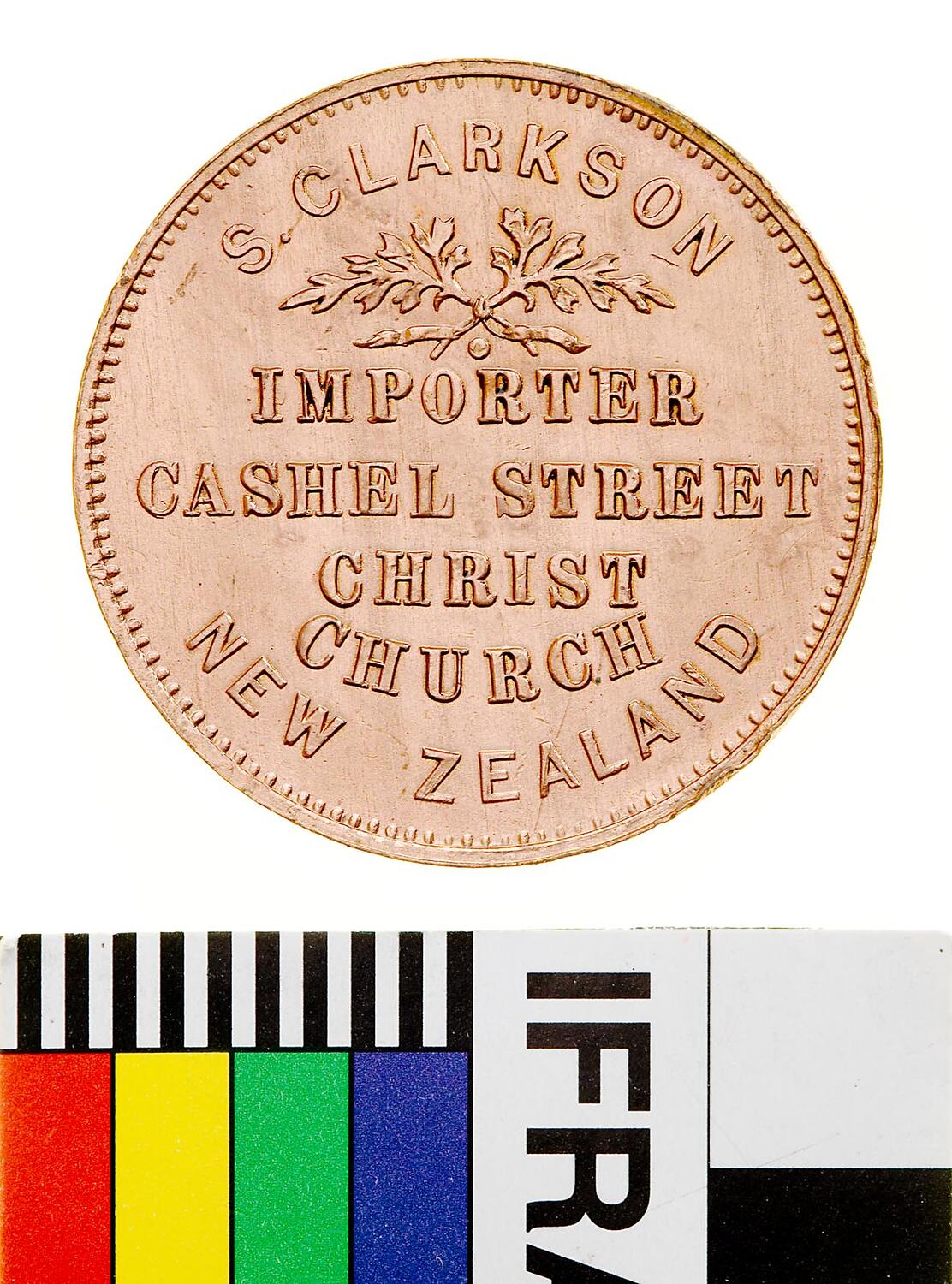 Obverse: S. CLARKSON IMPORTER CASHEL STREET CHRIST CHURCH NEW ZEALAND Reverse: NEW ZEALAND 1875