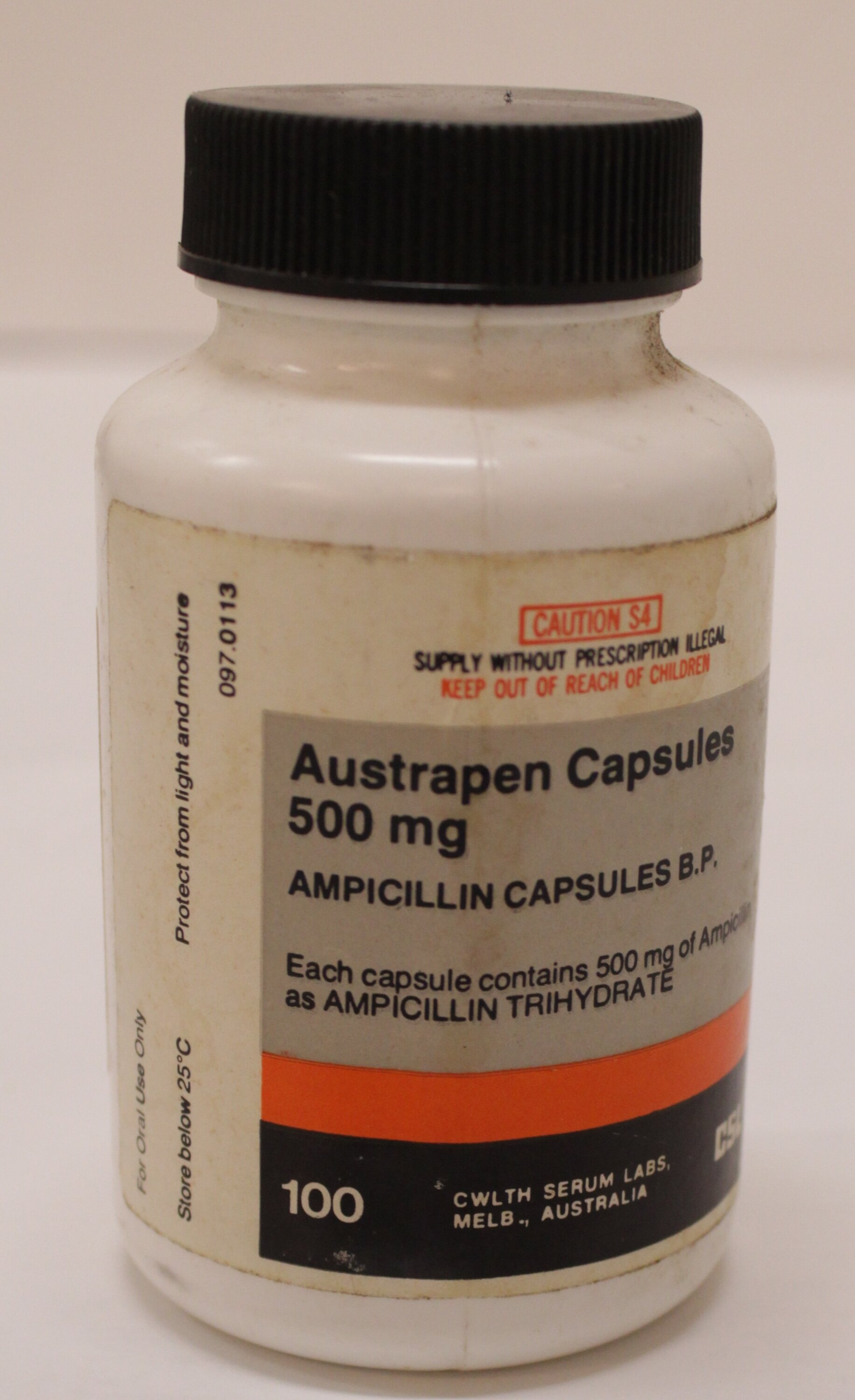 Label: CAUTION S4/SUPPLY WITHOUT PRESCRIPTION ILLEGAL/KEEP OUT OF REACH OF CHILDREN/Austrapen Capsules/500 mg/AMPICILLIN CAPSULES B.P./Each capsule contains 500mg of Ampicillin/as AMPICILLIN TRIHYDRATE/100/CWLTH SERUM LABS,/MELB., AUSTRALIA CSL.