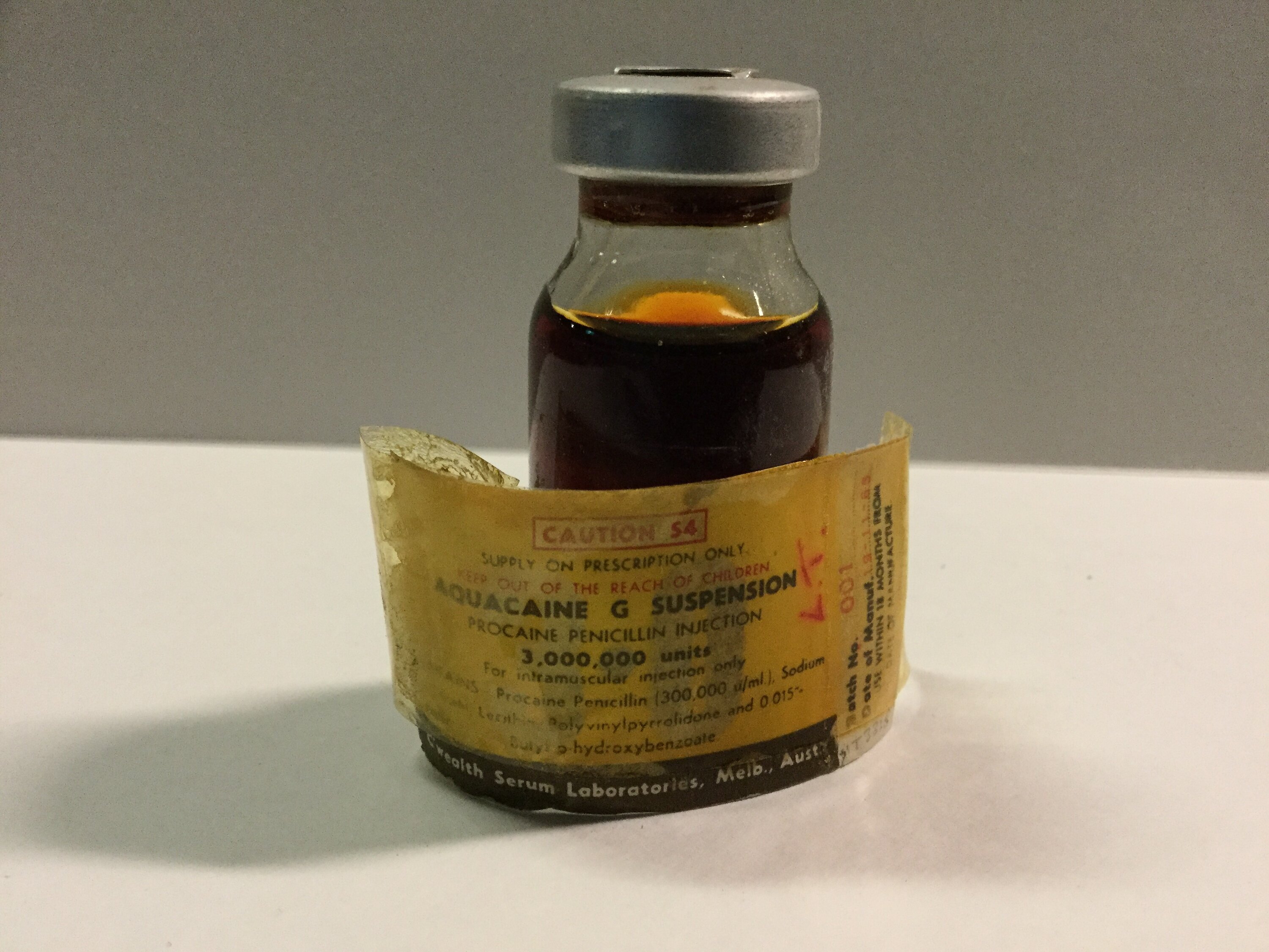 Bottle of Aquacaine G Suspension for injection. Made by Commonwealth Serum Laboratories (CSL) Limited, Parkville, Victoria, circa 1960s.