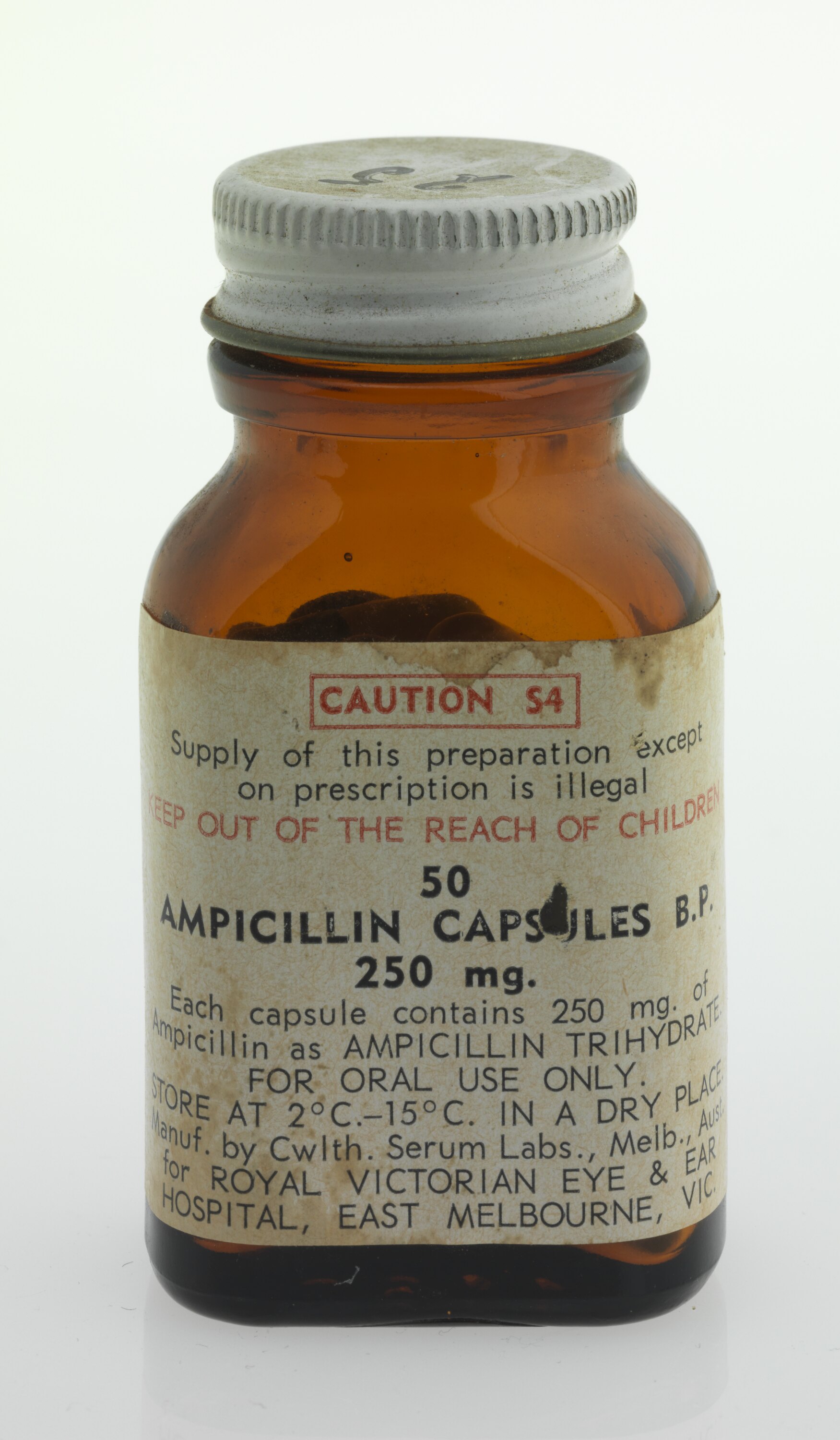 Label: CAUTION S4/Supply of this preparation except/on prescription is illegal/KEEP OUT OF THE REACH OF CHILDREN/50/AMPICILLIN CAPSULES B.P./250 mg./Each capsule contains 250 mg. of/Ampicillin as AMPICILLIN TRIHYDRATE/FOR ORAL USE ONLY./STORE AT 2oC.-15oC. IN A DRY PLACE./Manuf. by Cwlth Serum Labs., Melb., Aust./for ROYAL VICTORIAN EYE & EAR/HOSPITAL, EAST MELBOURNE, VIC. On lid: 25