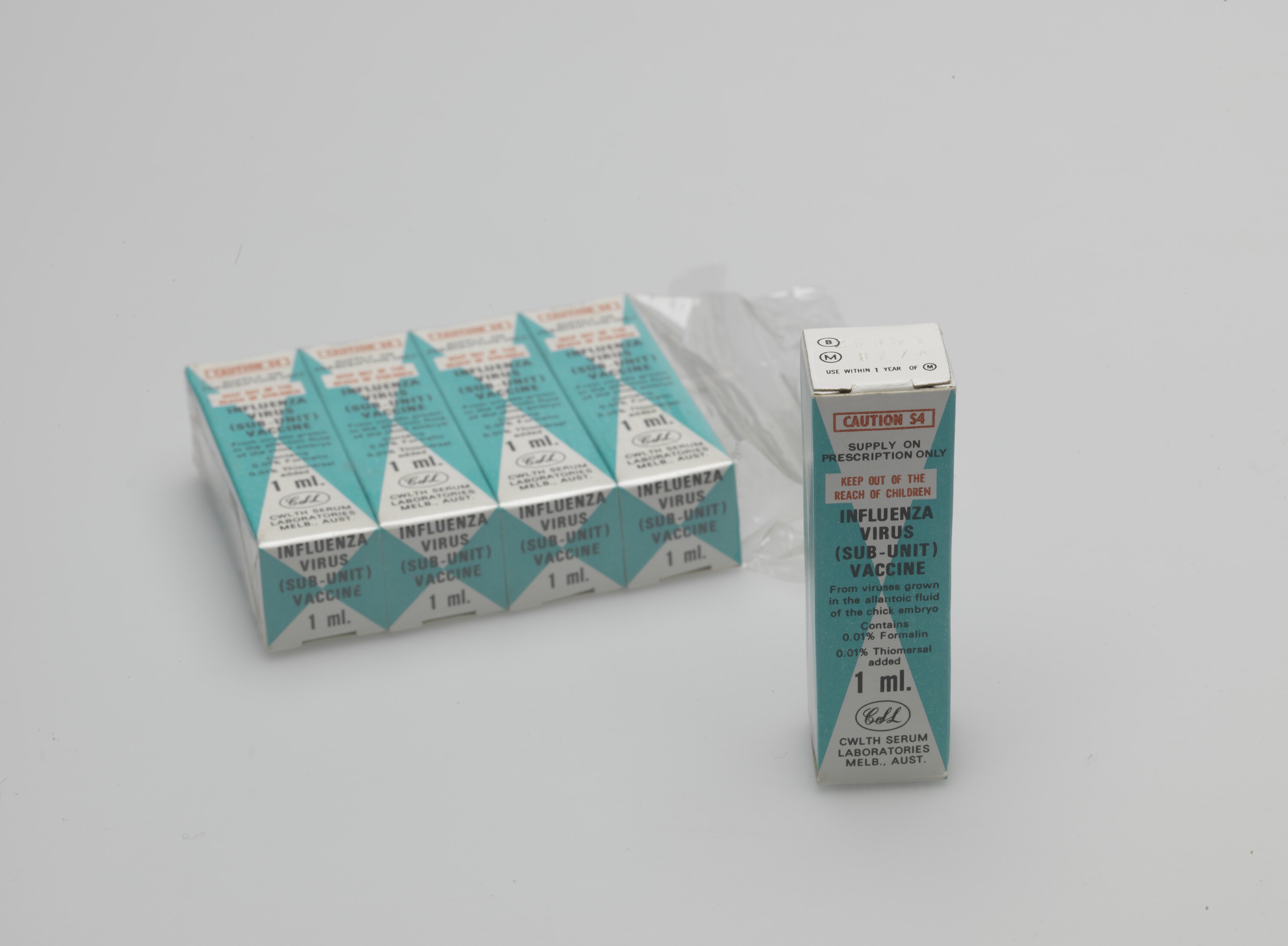 Five packages of Influenza virus vaccine. Expiry 8/1974. Manufactured by Commonwealth Serum Laboratories (CSL) Ltd, Parkville, Victoria.